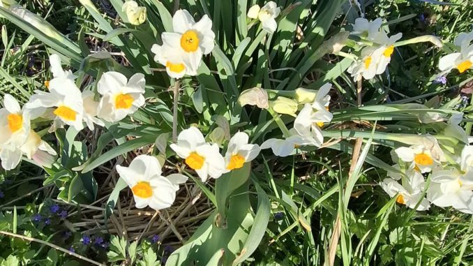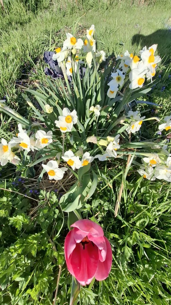 Le jardin est à nouveau bien lancé cette année! La forêt jardin côté haie vive prend forme. Et les plates-bandes côté ancienne Brûlerie sont déjà toutes jolies grâce au travail d’une demi-douzaine de personnes, grâce au composte généreusement offert par la commune, grâce à notre citerne d’eau et la pompe réparée par Lydie et son mari. On a aussi amélioré le point d’eau du fond du jardin suite au conseil du fontainier. Bref, c’est parti pour un bel été!